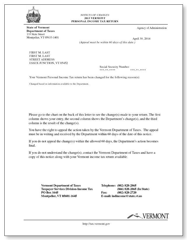 Vermont Department Of Taxes Notice Of Changes Sample 1